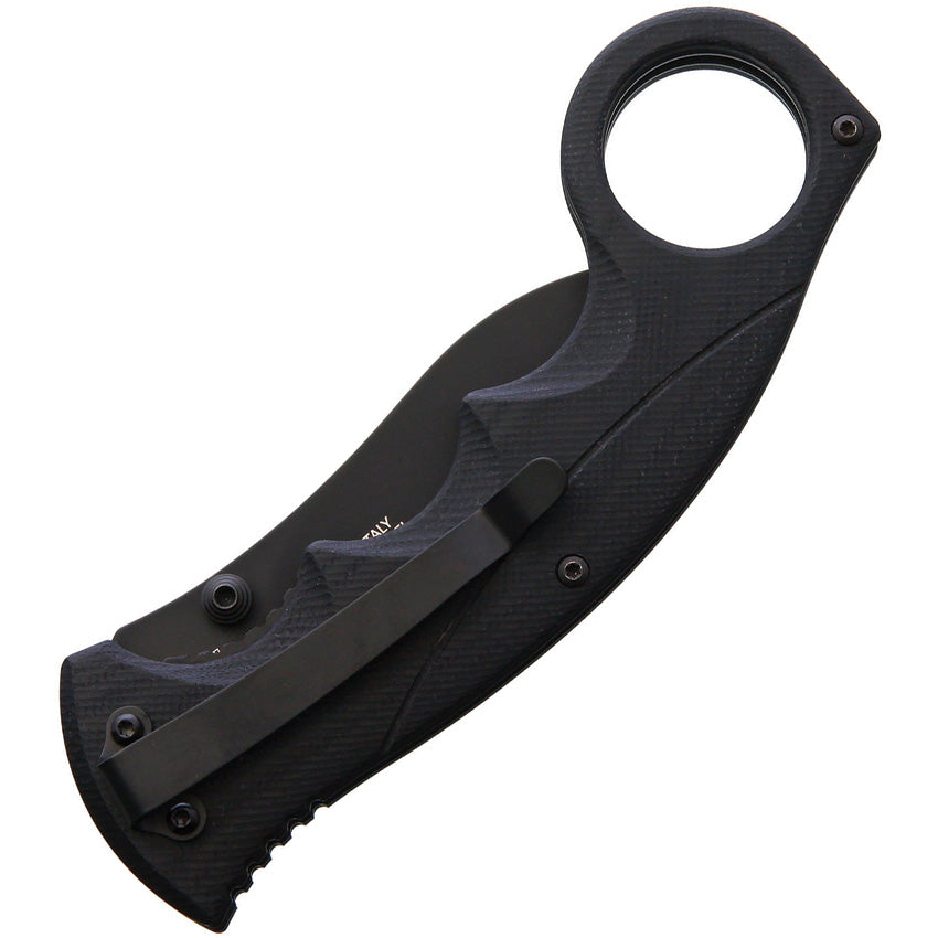 5" (12.7cm) closed. 3" (7.62cm) black coated Becut steel blade. Black G10 handle. Finger ring. Thumb stud. Pocket clip. Boxed.