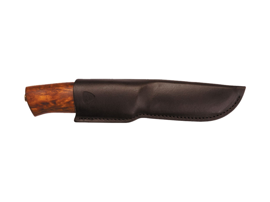 This all-round knife features a classic design tailored for medium to large hands. Its polished curly birch handle is ergonomically shaped to a satin finish, complemented by a distinct finger guard and stainless steel bolster near the blade.