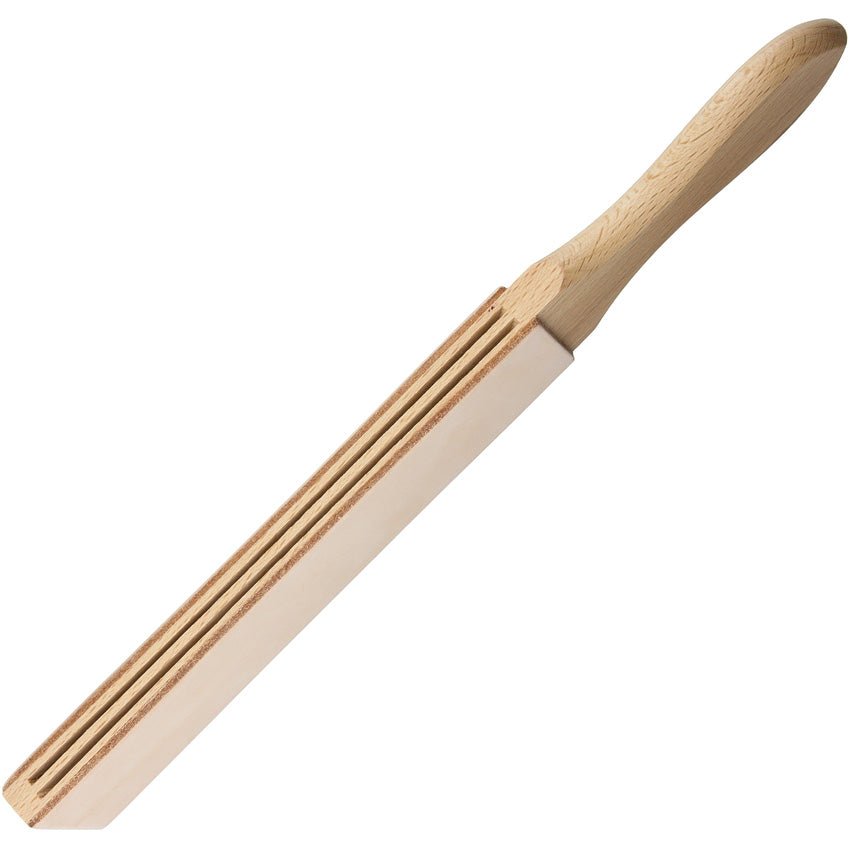 12 3/8" overall. 7 3/4" x 1 1/2" leather razor strop mounted to both sides of wood paddle block. Can be prepared with either solid or tube strop paste. Paddle base is slotted for flexibility. Bulk packed.