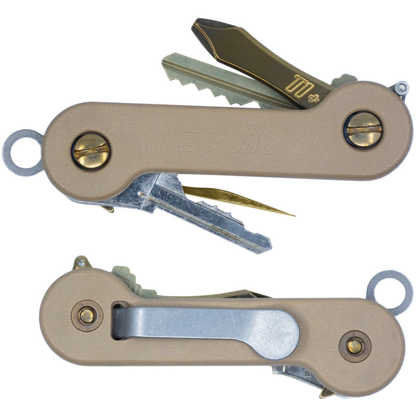3.5" overall. Coyote brown G10 construction. Tools include: Pocket clip and Key fob. Screws included (to hold 4, 8, or 12 keys). Load keys in preferred order. O-rings keep keys snug and allow for adjustment of tension. Washers between keys for easy deployment. Includes link for key fob. Holds up to 12 keys. Keys and accessories not included. Hang packaged.