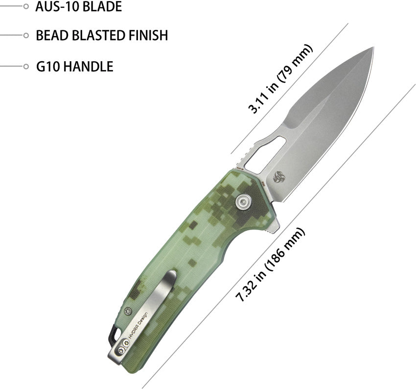 4.25" (10.8cm) closed. 3.13" (7.95cm) bead blast finish AUS-10A stainless blade. Digital camo G10 handle. Thumb pull. Extended tang. Lanyard hole. Pocket clip. Boxed.