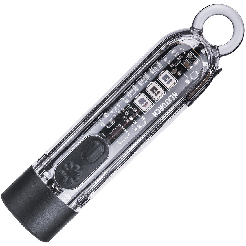 2.88" overall. Water resistant. Impact resistant. Clip. Rechargeable. Strobe. White, red, blue, and UV LEDs. 78m beam distance. Modes: High-White (300 lumens, 1h runtime); Medium (50 lumens, 1h 30m runtime); Low (10 lumens, 9h 15m runtime). Requires (1) Lithium battery (included). Aluminum and PC construction. Boxed with hanging tab.