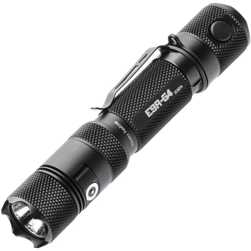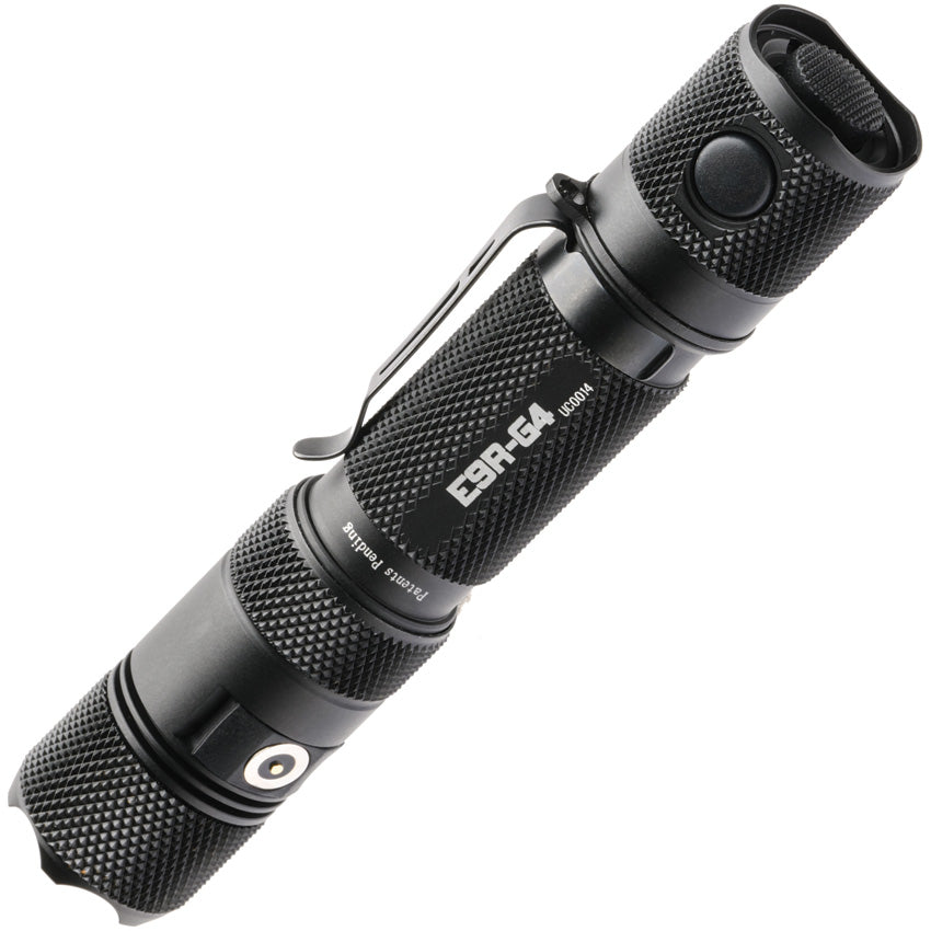 5.5" overall. Impact resistant. Clip. Rechargeable. Strobe. IPX8 waterproof submersible up to 2 meters under water. CREE XHP50 White LED. Modes: Turbo (2550 lumens, 2.02h runtime); High (1135 lumens, 2.11h runtime); Medium (270 lumens, 5.7h runtime); Low (71 lumens, 20.9h runtime); Firefly (0.64 lumen, 50 day runtime). 197m beam distance. Magnetic charging and Micro USB charging ports. Low battery indicator. Striking bezel. Spare O-rings. USB magnetic cable. Engineered plastic holster. Requires (1) 18650 battery (included), or (2) CR123A batteries (not included). Aluminum construction. Color: Black. Boxed.