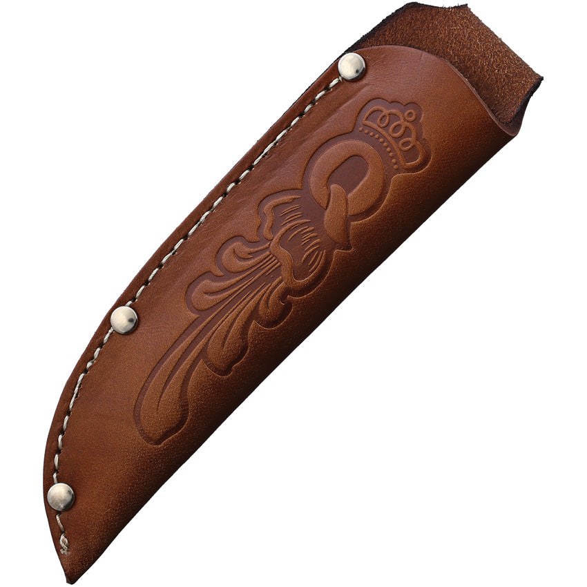 6" (15.24cm) overall. 2.75" (6.99cm) satin finish stainless blade. Winterbottom jigged bone handle. Stainless guard and pommel. Brown leather belt sheath. Boxed.