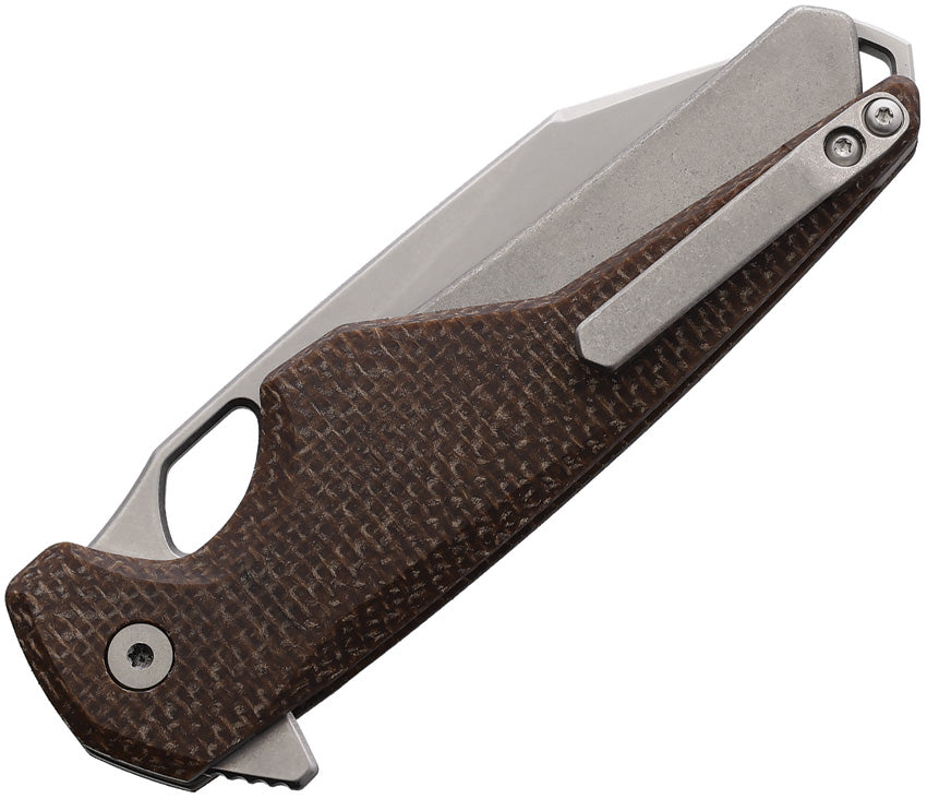 4.25" (10.8cm) closed. 3.25" (8.26cm) stonewash finish MagnaCut steel sheepsfoot blade. Brown canvas micarta handle. Extended tang. Thumb pull. Lanyard hole. Pocket clip. Boxed.