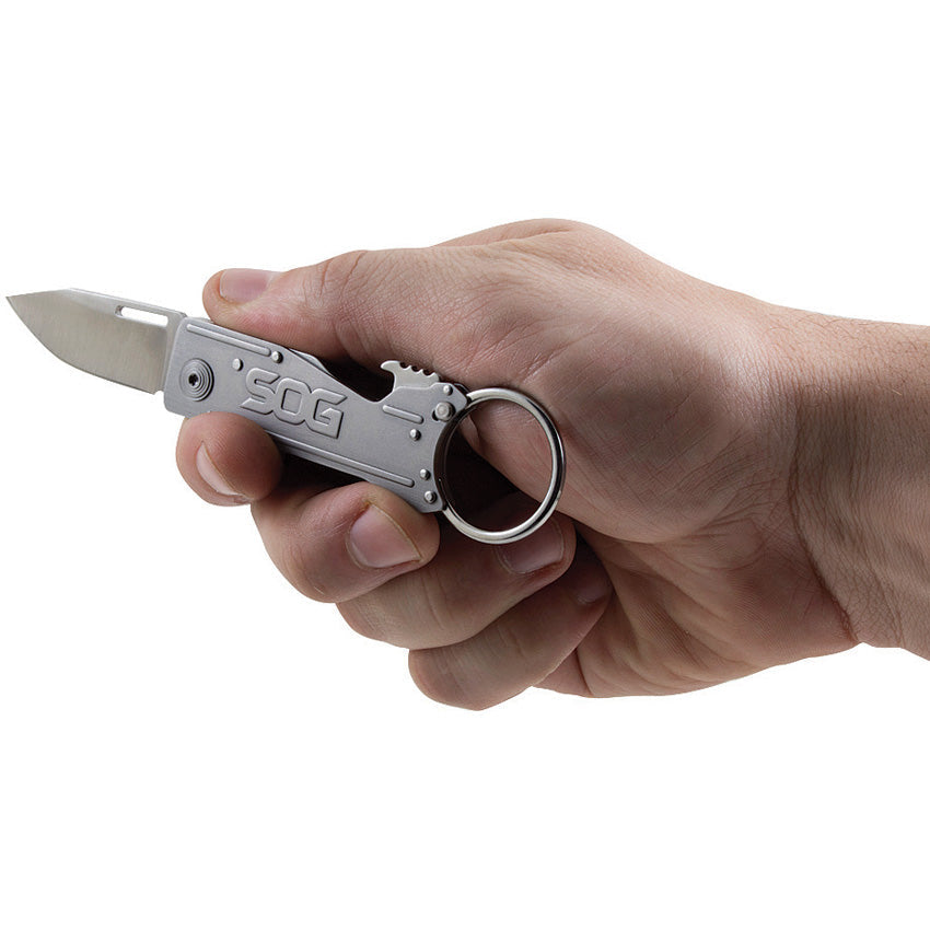 3,5" geschlossen. 1,88" Edelstahl-Clippoint-Klinge mit Satin-Finish. Griff aus satiniertem Edelstahl. Integrierter Schlüsselring und Flaschenöffner. Muschelverpackt.