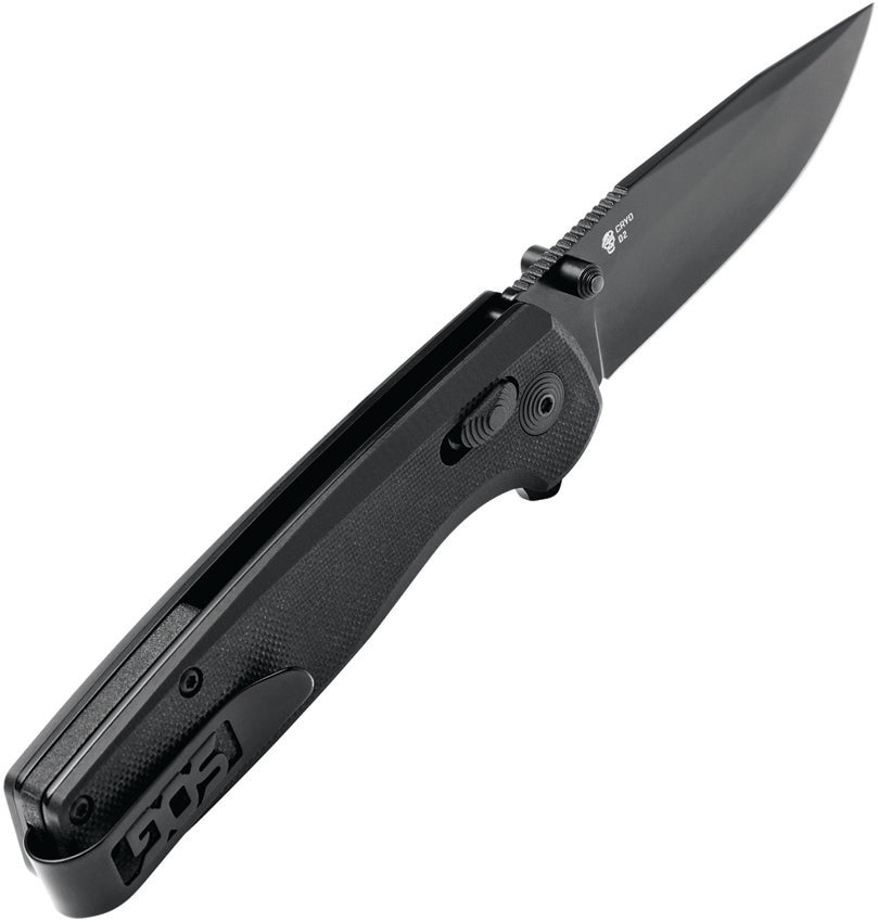 4,25" (10,8 cm) geschlossen. 3,00" (7,62 cm) schwarz lackierte Klinge aus D2-Werkzeugstahl. Griff aus schwarzem G10. Daumenbolzen. Taschenclip. Erweiterter Zapfen. Verpackt.