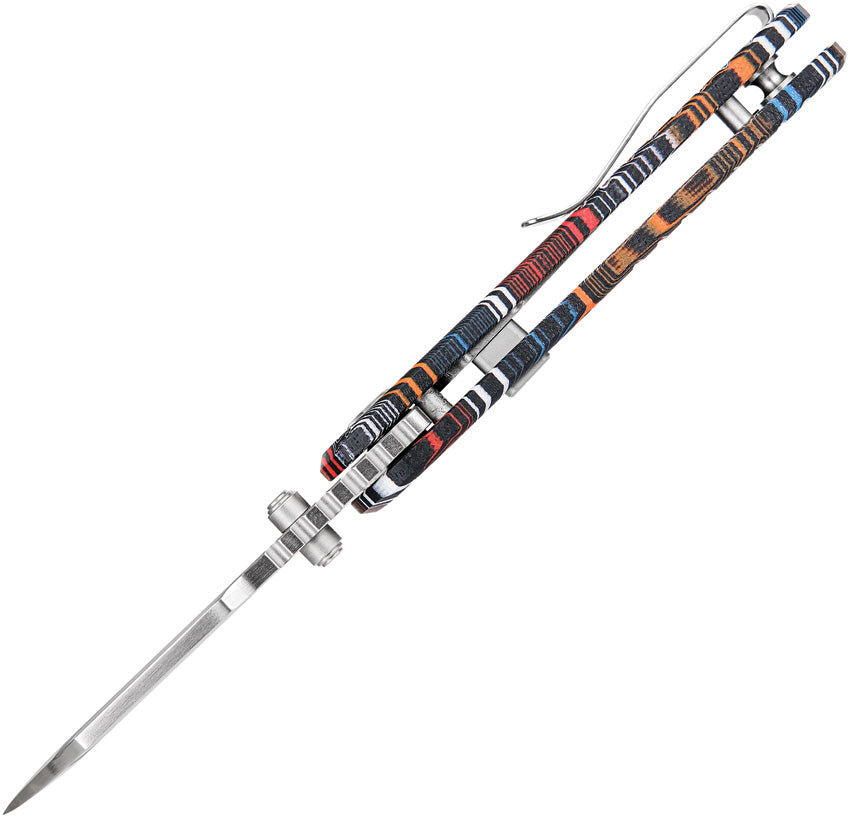 4.13" (10.49cm) closed. 3" (7.62cm) satin finish S35VN stainless sheepsfoot blade. Multi G10 G-Mascus handle. Thumb stud. Lanyard hole. Pocket clip. Black nylon zippered storage case. Boxed.