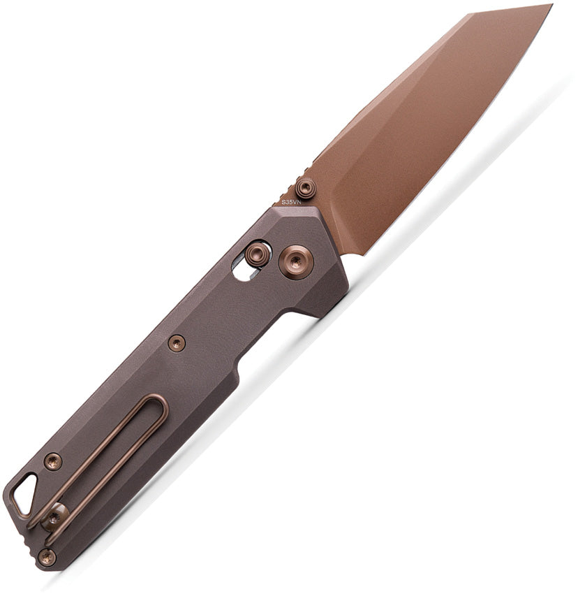 4.13 (10.49cm) closed. 2.9 (7.37cm) copper finish S35VN stainless blade. Copper Dune titanium handle. Thumb stud. Lanyard hole. Pocket clip. Black nylon zippered storage case. Boxed.