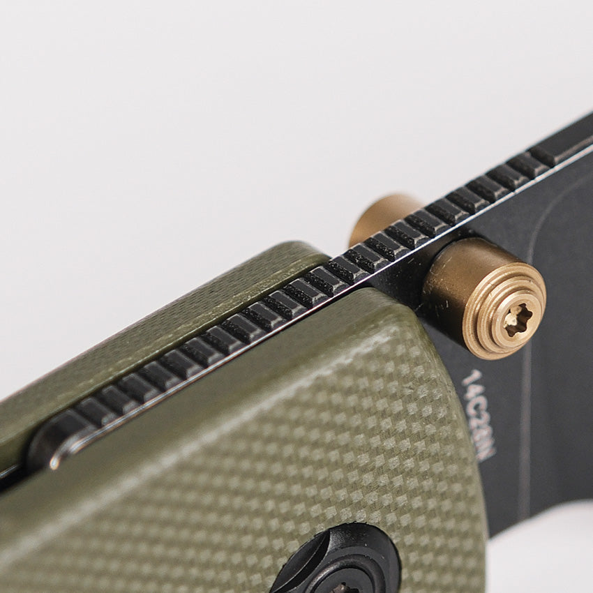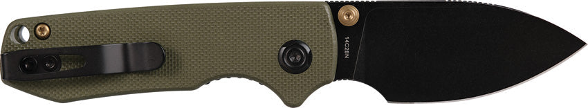 3.25" (8.26cm) closed. 2.25" (5.72cm) black stonewash finish 14C28N Sandvik stainless blade. Green G10 handle. Thumb stud. Lanyard hole. Pocket clip. Black nylon zippered storage case. Boxed.