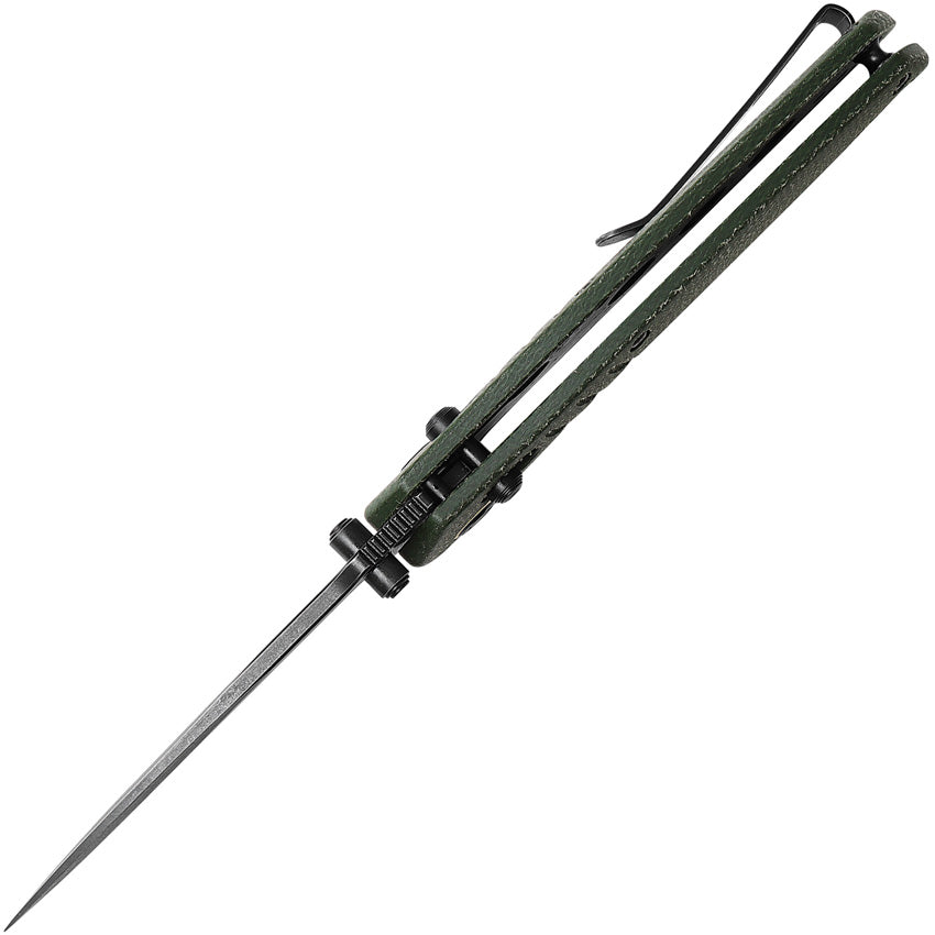 4.25" (10.8cm) closed. 3.25" (8.26cm) black stonewash finish Nitro V steel modified drop point blade. Green canvas micarta handle. Thumb stud. Lanyard hole. Pocket clip. Boxed.
