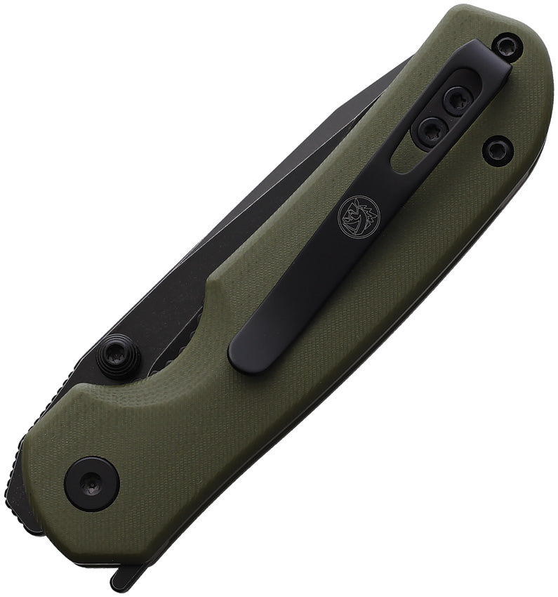 3.5" (8.89cm) closed. 2.63" (6.68cm) black stonewash finish 14C28N Sandvik stainless blade. Green G10 handle. Extended tang. Pocket clip. Thumb stud. Black nylon zippered storage case. Boxed.