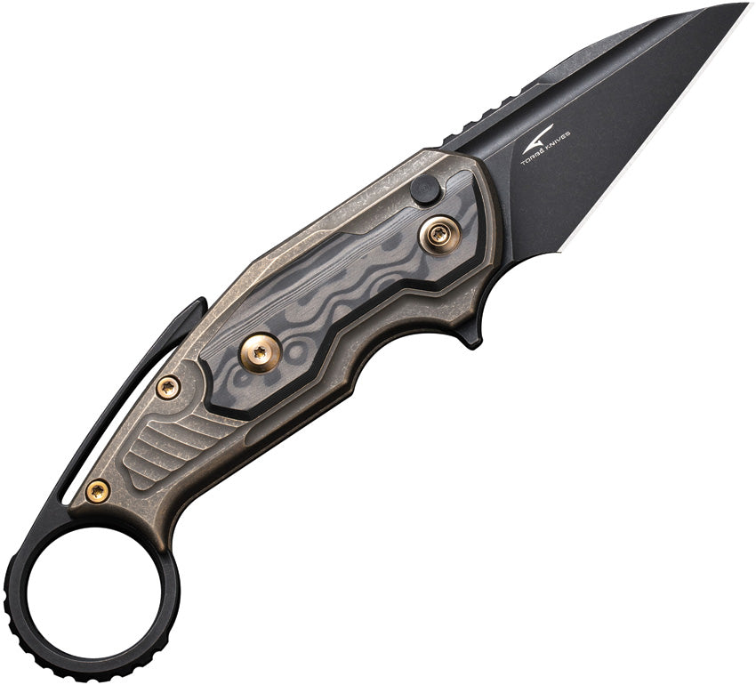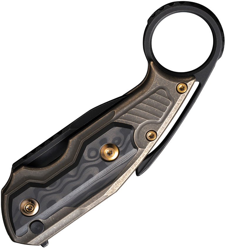 5.13"" (13.03cm) closed. 2.38"" (6.05cm) black stonewash finish CPM-20CV stainless blade. Bronze titanium handle with Rose carbon fiber inlay. Extended tang. Finger ring. Pocket clip. Black nylon zippered storage case. Boxed.