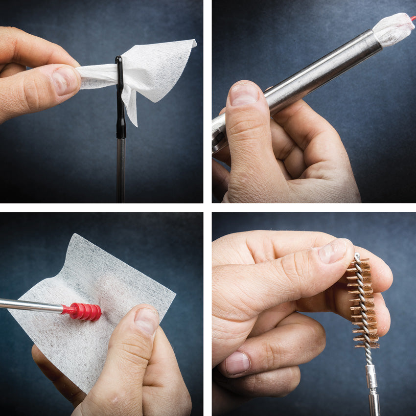 Includes: T-handle; Small and large slotted bore patch tips; Bore patch jags (.22, .357, .38, 9mm, .40, .45 caliber); Phosphor bronze bore brushes (.22, .357, .38, 9mm, .40, .45 caliber); (1) Rotating and (1) fixed rod section that combine to form a 9" rod; (50) Cleaning patches; Compact zippered storage case. Clam packed.