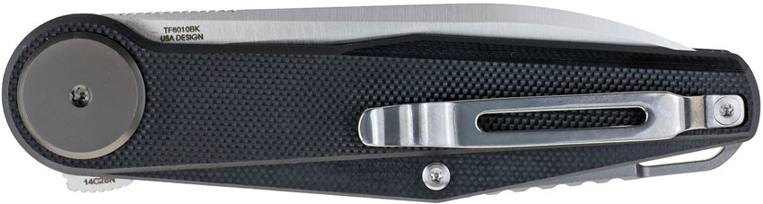 4.25" (10.8cm) closed. 3.25" (8.26cm) satin finish 14C28N Sandvik stainless blade. Black G10 handle. Pocket clip. Lanyard hole. Extended tang. Boxed.