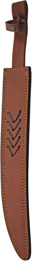 25.5" (64.77cm) overall. 16.5" (41.91cm) Damascus steel blade. Stainless guard. Engraved ash wood handle with bone spacers. Brown leather belt sheath. Boxed.