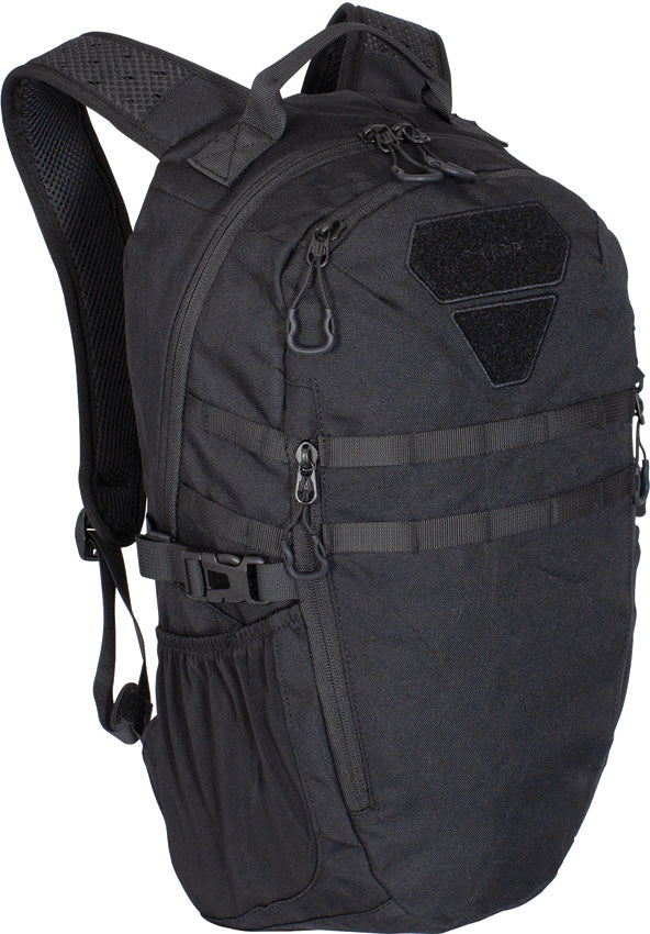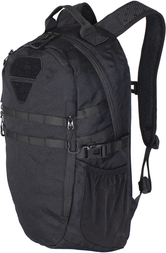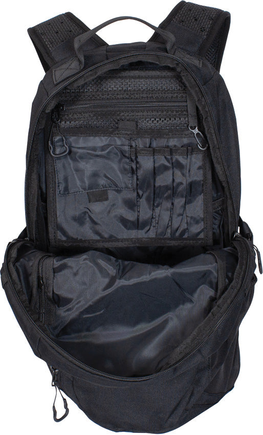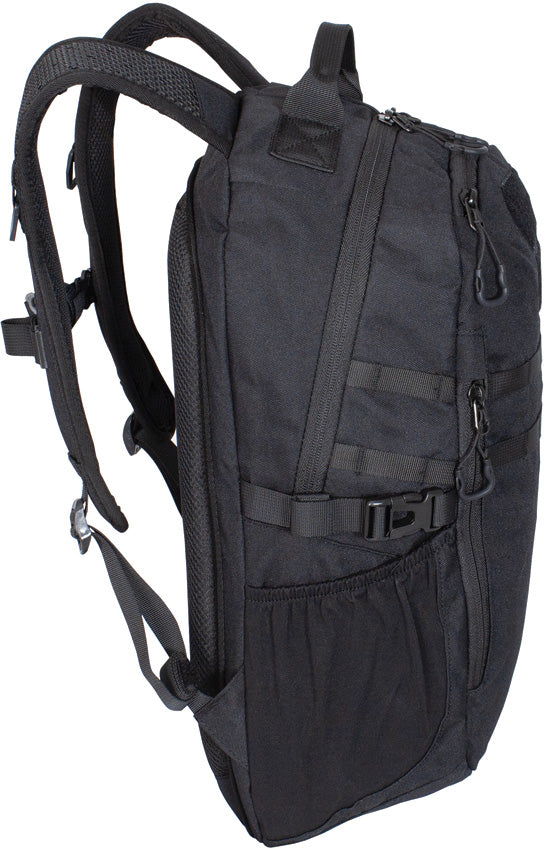 Dimensions: 18.88" x 11" x 5.75". 20 liter capacity. Front zipped stash pocket. Front zipped large pocket. Front zip quick access to main compartment. (2) side compression straps. (2) elastic side pockets. Detachable inner organizer. Adjustable padded shoulder and chest straps. Airmesh padded back system. Hook and loop ID patch. Hydration pocket with pass through port. Color: Black. Bulk packed.