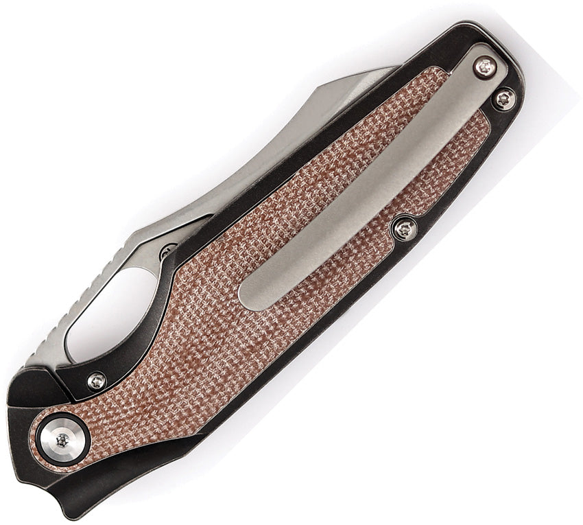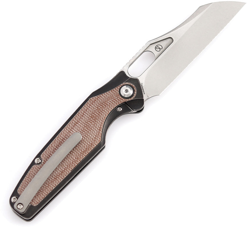 4.5" (11.43cm) closed. 3.5" (8.89cm) satin finish CPM-20CV stainless blade. Black stonewash finish titanium handle with brown micarta inlay. Pocket clip. Thumb pull. Black nylon pouch. Boxed.
