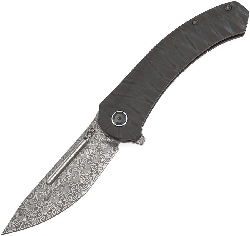 4.5" (11.43cm) closed. 3.5" (8.89cm) Damascus steel tanto blade. Flame anodized titanium handle. Extended tang. Pocket clip. Boxed.