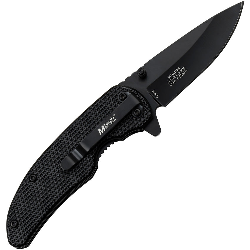 Assisted opening. 3.75" (9.53cm) closed. 2.75" (6.99cm) black oxide coated 3Cr13 stainless blade. Black aluminum handle. Extended tang. Thumb stud. Pocket clip.