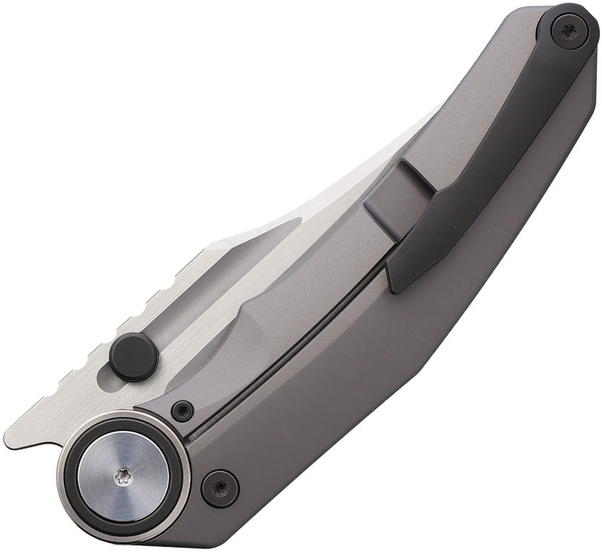 4.63" (11.76cm) closed. 3.5" (8.89cm) satin finish Bohler M390 stainless clip point blade. Gray titanium handle. Thumb stud. Pocket clip. Storage case.