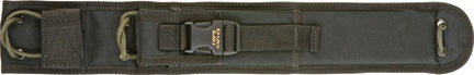 16 3/4" overall. 11 1/2" 1095 carbon steel blade with sawback and black traction coating. Black linen micarta handles. Black nylon belt sheath with sharpening stone pouch.