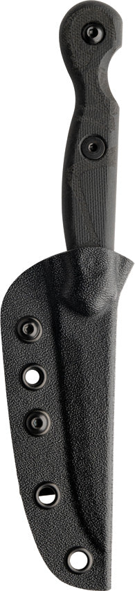 7.63" (19.38cm) overall. 3.38" (8.59cm) black traction coated 1095HC steel blade. Black linen micarta handle. Full tang. Black Kydex belt sheath. Bagged.