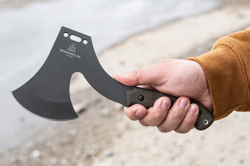 11" overall. 5.13" gray Tungsten Cerakote 1095HC steel axe head with 4" cutting edge. Green canvas micarta handle. Full tang. Lanyard hole. Brown leather belt sheath. Bulk packed.