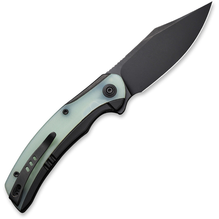 4.5" (11.43cm) closed. 3.5" (8.89cm) black stonewash finish CPM-20CV stainless blade. Black titanium handle with jade G10 onlay. Extended tang. Pocket clip. Black nylon zippered storage case. Boxed.