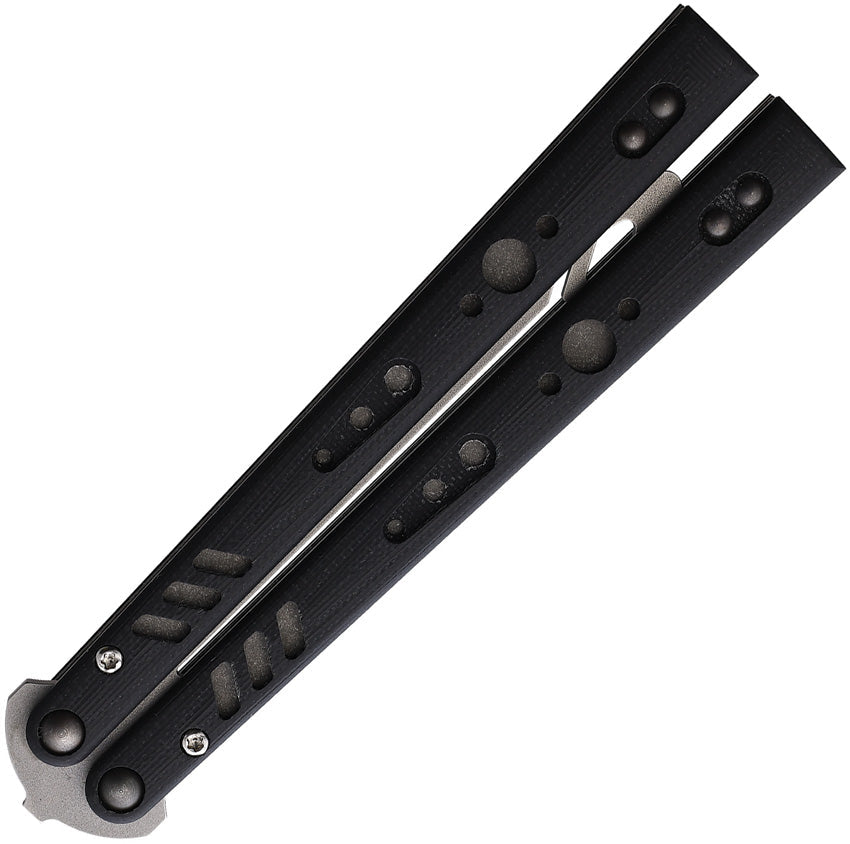 5.75" (14.61cm) closed. 4.5" (11.43cm) stonewash finish unsharpened stainless blunt tip blade. Black G10 handle. Black synthetic zippered storage case. Boxed.