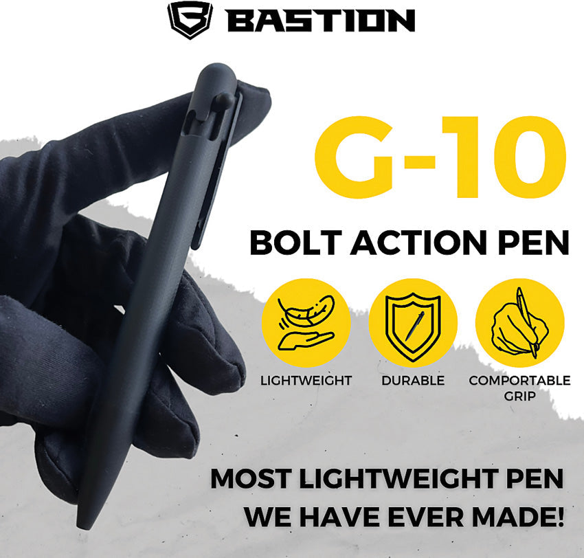 5.25" overall. Pocket clip. Bolt action operation. Uses Parker style ink cartridges. Black G10. Boxed.