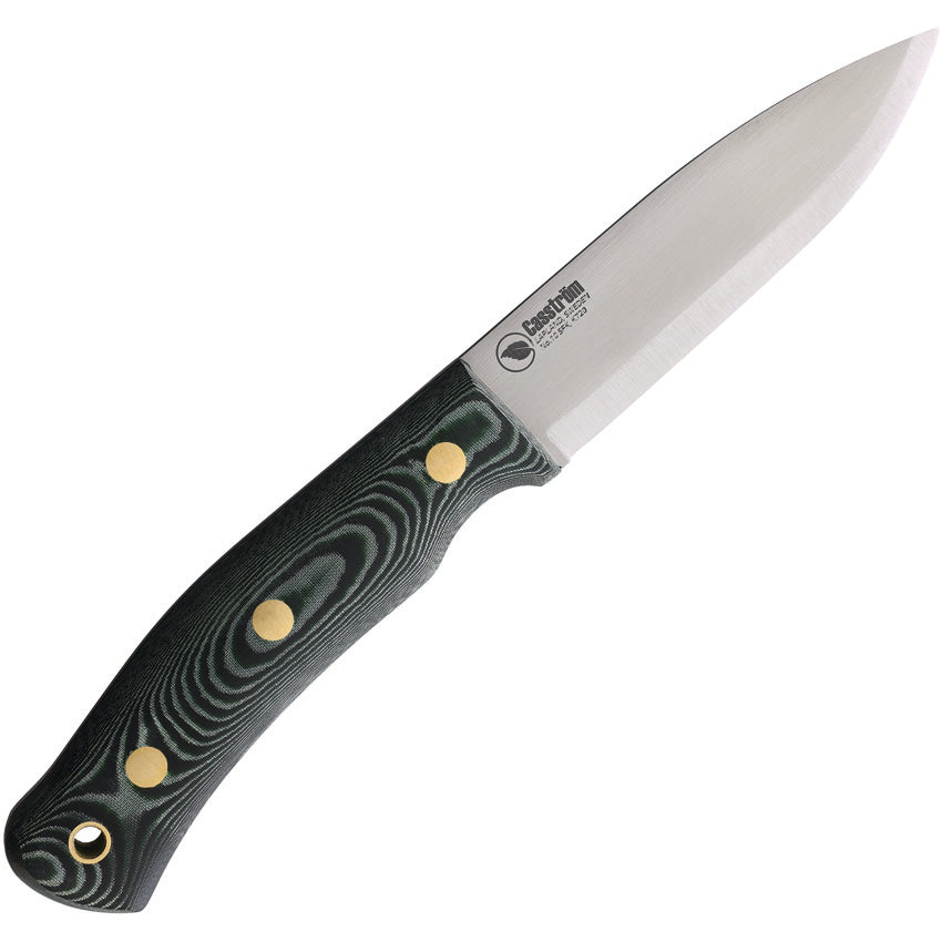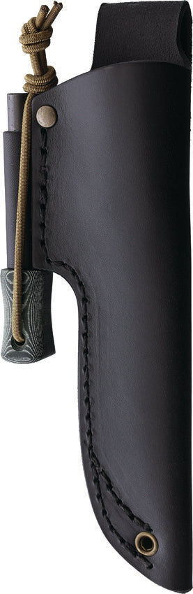 8.66" (22cm) overall. 4" (10.16cm) satin finish Scandi grind blade. Green canvas micarta handle. Full tang. Lanyard hole. Uddeholm Sleipner steel blade. 3mm vegetable-tanned leather sheath with drain hole and fire steel striker. Black leather belt sheath. Boxed.