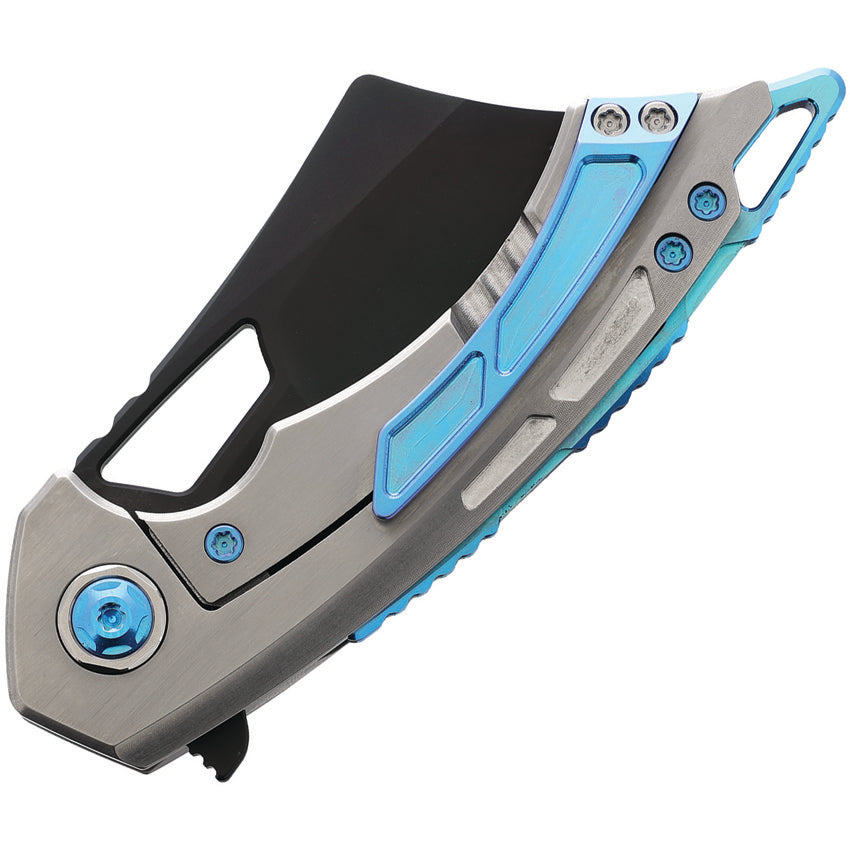 5" (12.7cm) closed. 3.25" (8.26cm) black coated CPM S90V stainless blade. Blue and silver titanium handle. Extended tang. Thumb pull. Lanyard hole. Pocket clip. Boxed.