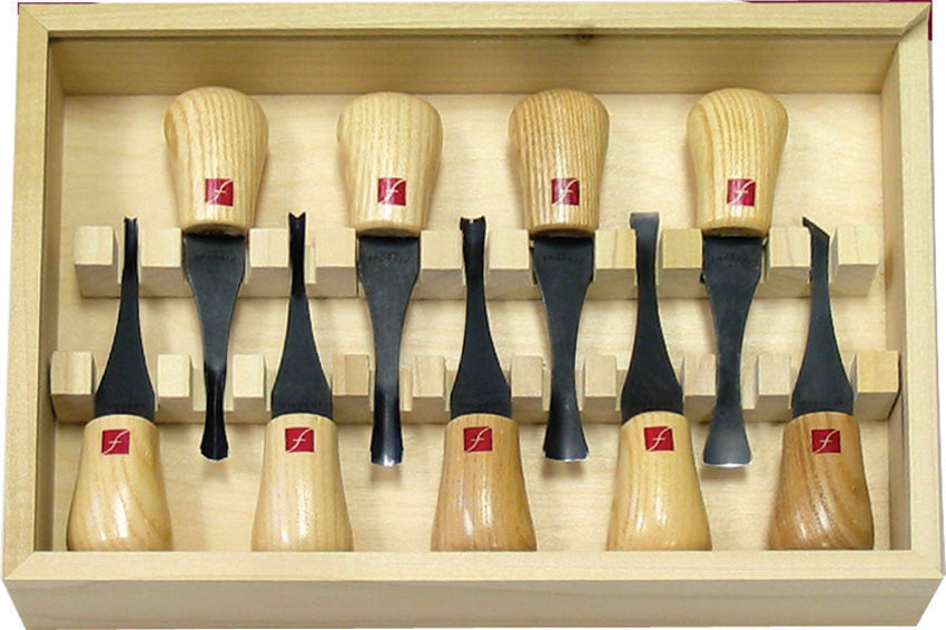 Includes (9) high carbon steel palm tool carving blades - FR308 #2 x 5/16"; FR305 #3 x 3/8"; FR306 #6 x 5/16"; FR309 #11 x 1/8"; FR307 70 deg. x 1/4"; and wooden storage box. Wood handles. Features the regular palms for detail and the wide format for roughing-out; making this a great collection in one convenient box.