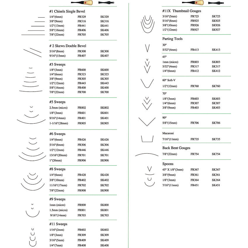 carbon steel blade. Wood handle. Palm Tools included: FR802 #5 x 2.5mm, FR800 #9 x 1mm, FR801 #9 x 1.5mm, and FR803 45 deg. X 1mm. Designed for extreme detail used in netsuke or caricature carving. These tools have their edges forged down even thinner than our other palm tools. Cutting with these fine edges allows the carver to work extremely close to adjacent detail without crushing wood fibers that can lead to chipping out. Storage case.