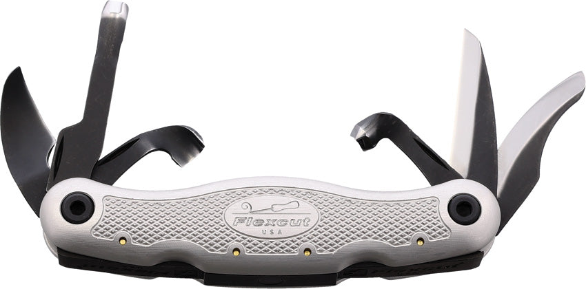 4.25" (10.8cm) closed. High carbon stainless blade. Silver aluminum handle. Right hand version. Detail knife, Straight gouge, Hook knife, V-Scorp, Gouge scorp, Pelican knife. Includes Slipstrop and FlexCut Gold polishing compound. Natural leather belt sheath. Clam packed.