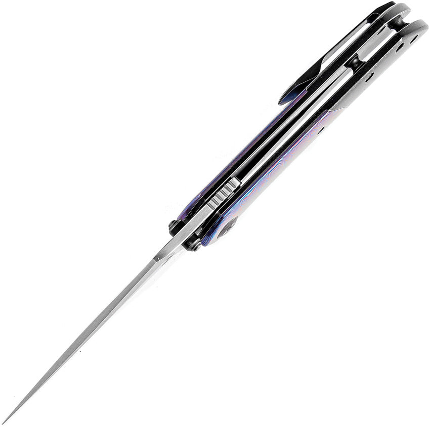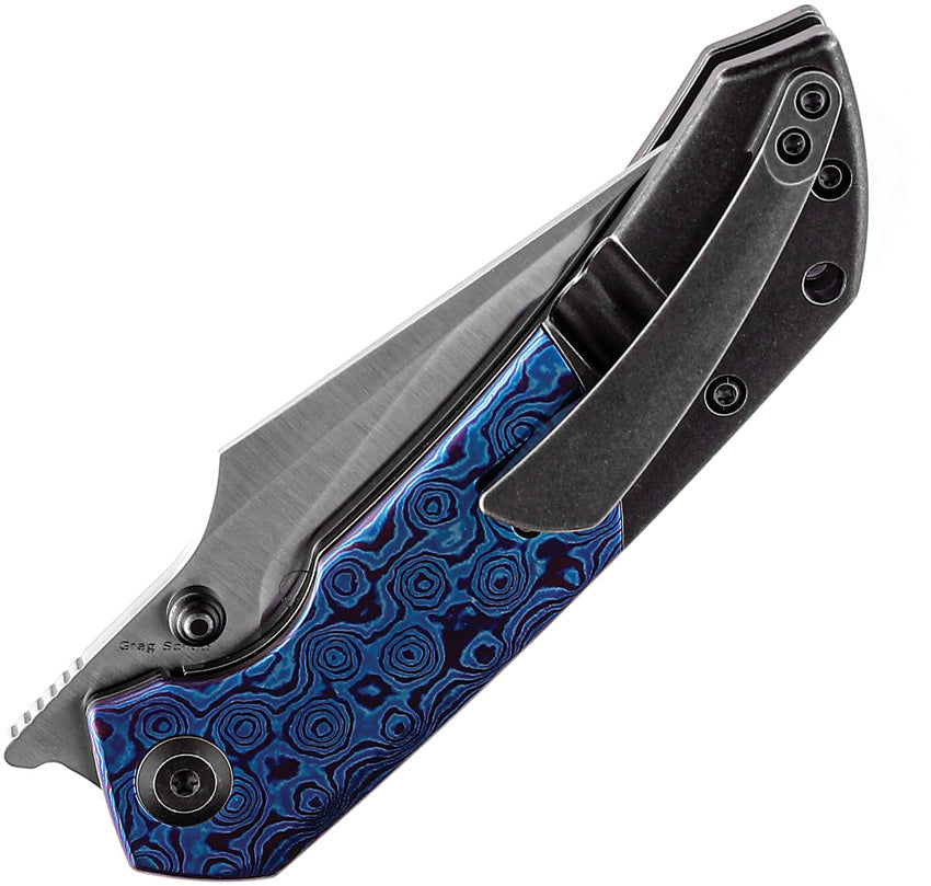 4.5" (11.43cm) closed. 3.5" (8.89cm) satin finish CPM S35VN stainless blade. Black stonewash finish titanium handle with Timascus inlay. Thumb stud. Lanyard hole. Pocket clip. Black nylon pouch. Boxed.