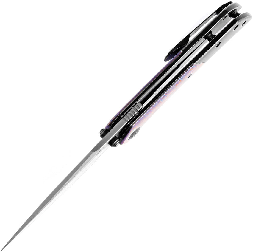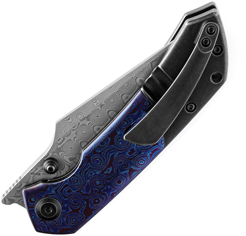 4.5" (11.43cm) closed. 3.5" (8.89cm) Damascus steel blade. Black stonewash finish titanium handle with Timascus inlay. Thumb stud. Lanyard hole. Pocket clip. Black nylon pouch. Boxed.