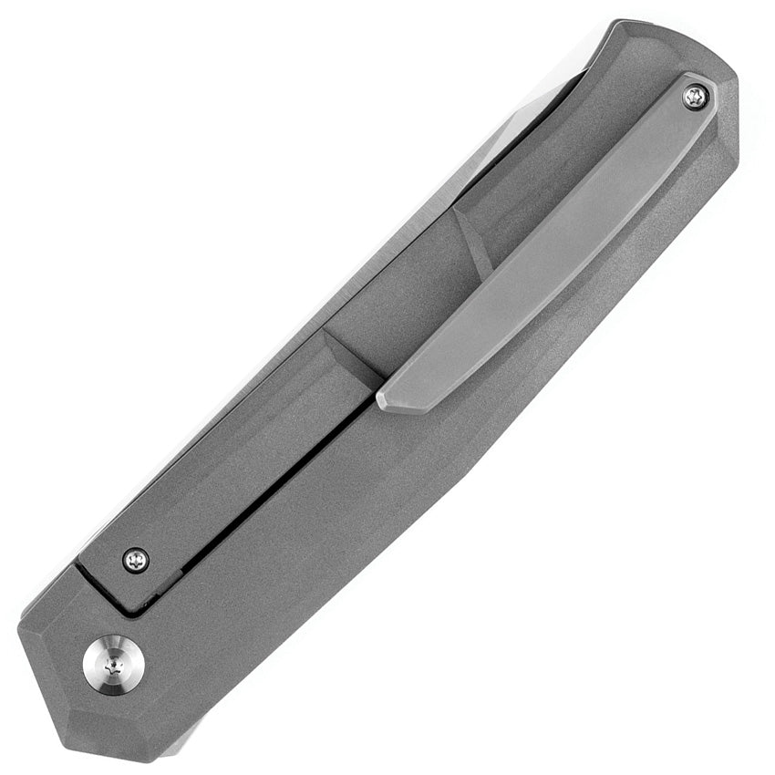4.88" (12.4cm) closed. 3.75" (9.53cm) satin finish Bohler M390 stainless blade. Silicone carbide titanium handle. Extended tang. Pocket clip. Black nylon pouch. Boxed.