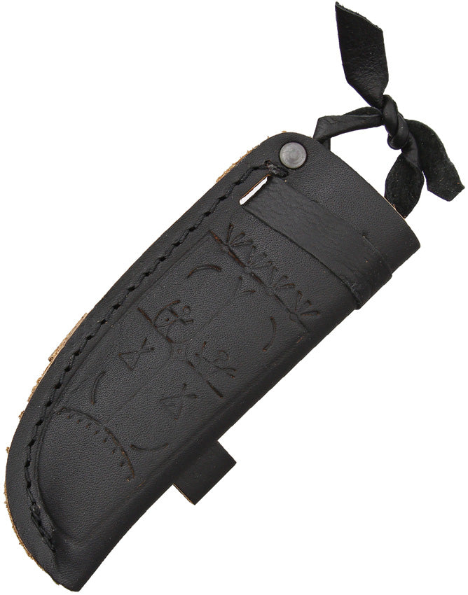 7" overall. 2 3/4" stainless Sandvik 12C27 blade. Round design, one-piece, oiled curly birch handle with decorative star inlay. Deluxe black leather belt sheath with protective insert. Boxed with hanging tab.