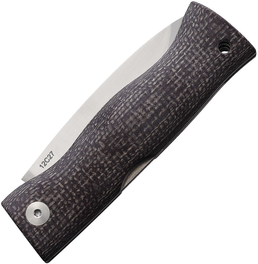 3.75" (9.53cm) closed. 2.75" (6.99cm) satin finish 12C27 Sandvik stainless blade. Gray micarta handle. Lanyard hole. Boxed.