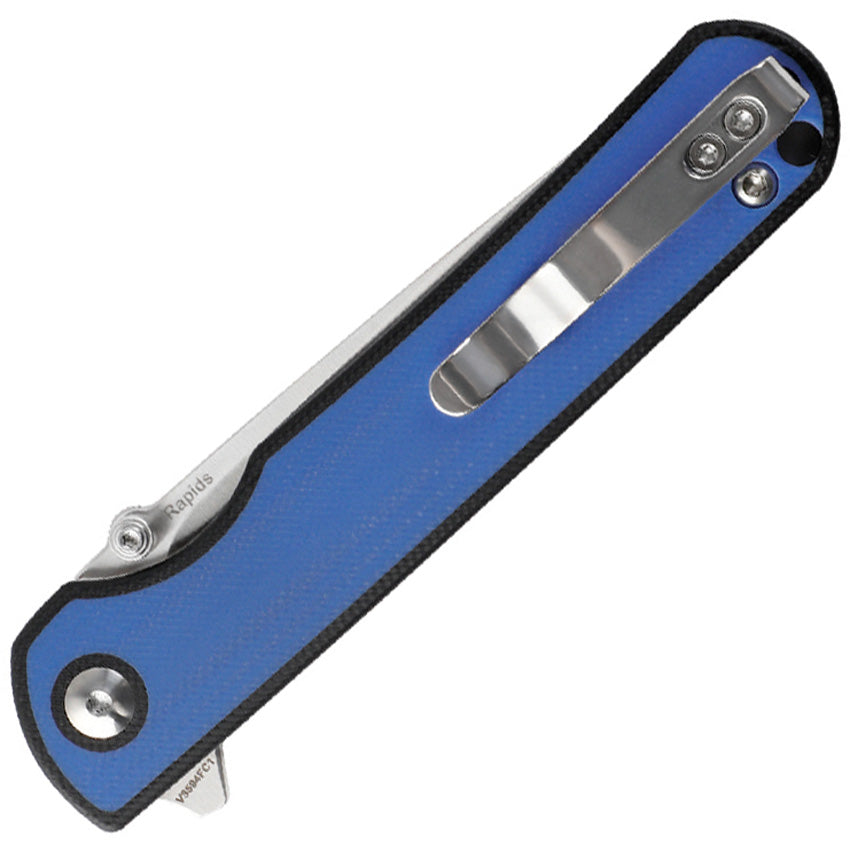 4,5" (11,43 cm) cerrado. 3,5" (8,89 cm) hoja de acero inoxidable de 154 cm con acabado satinado. Mango G10 azul y negro. Espiga extendida. Orificio para cordón. Clip de bolsillo. Perno de pulgar. En caja.