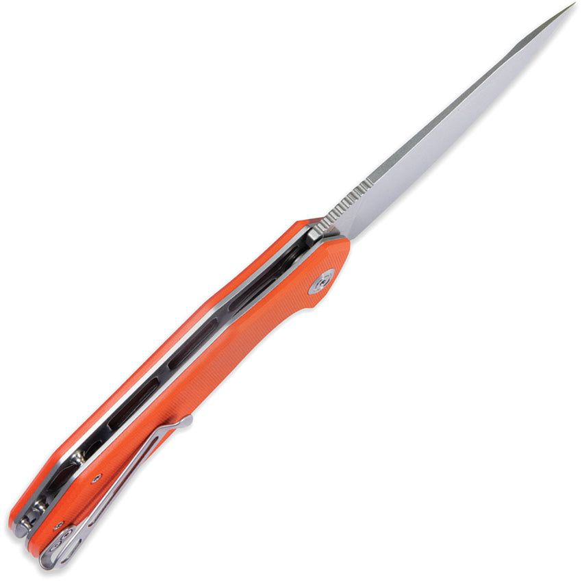 4.88" (12.4cm) closed. 3.63" (9.22cm) stonewash finish D2 tool steel blade. Orange G10 handle. Extended tang. Pocket clip. Boxed.