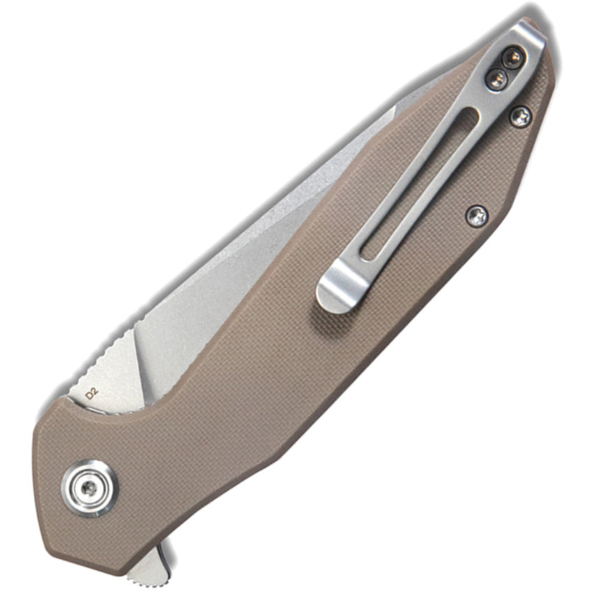 4.88" (12.4cm) closed. 3.63" (9.22cm) stonewash finish D2 tool steel blade. Tan G10 handle. Extended tang. Pocket clip. Boxed.