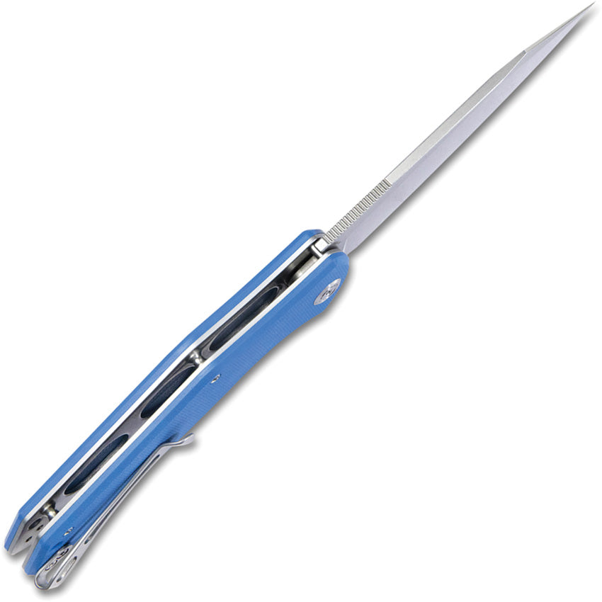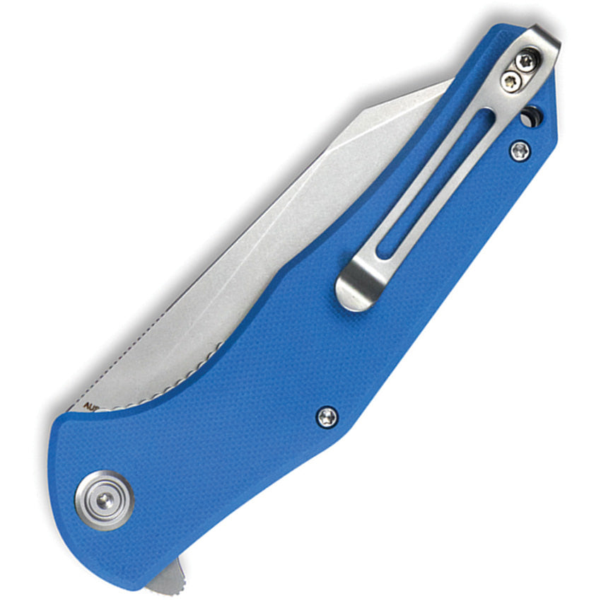 4.75" (12.07cm) closed. 3.75" (9.53cm) stonewash finish D2 tool steel blade. Blue G10 handle. Extended tang. Lanyard hole. Pocket clip. Boxed.
