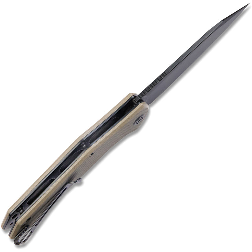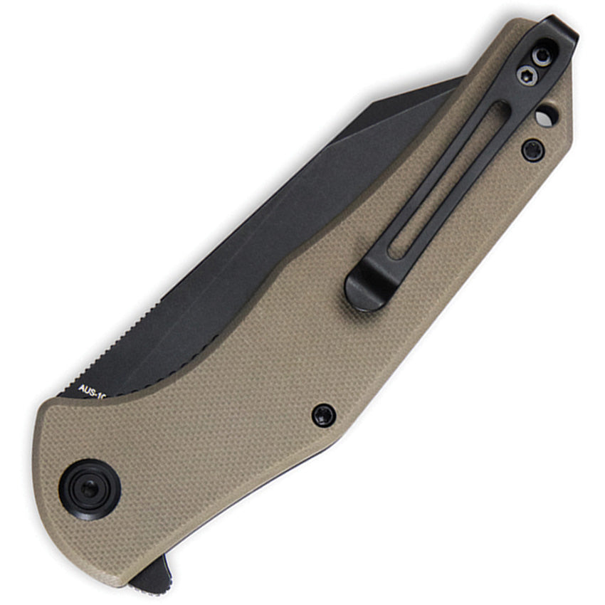 4.75" (12.07cm) closed. 3.75" (9.53cm) black stonewash finish D2 tool steel blade. Tan G10 handle. Extended tang. Lanyard hole. Pocket clip. Boxed.