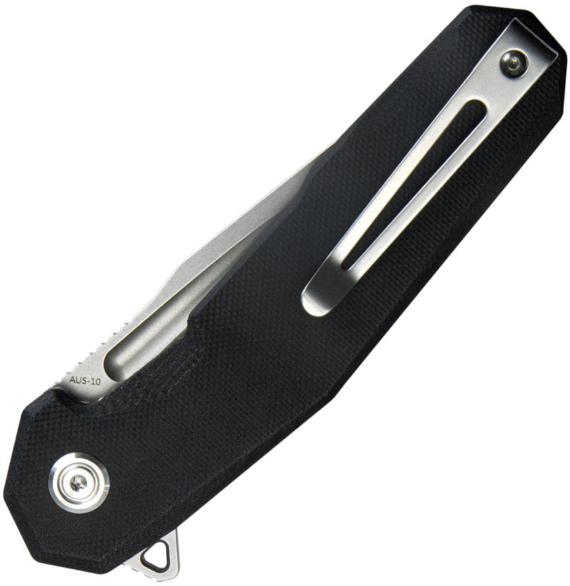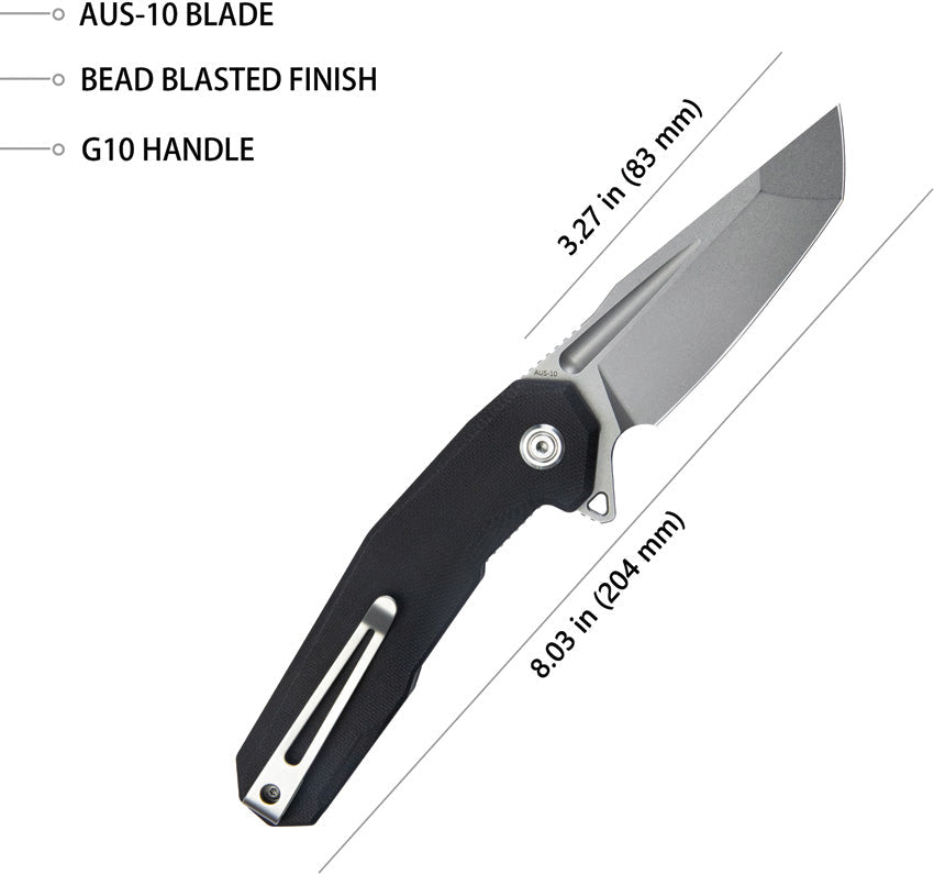 4.63" (11.76cm) closed. 3.63" (9.22cm) bead blast finish D2 tool steel tanto blade. Black G10 handle. Extended tang. Lanyard hole. Pocket clip. Boxed.