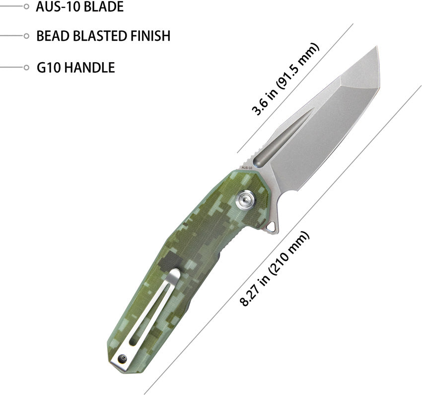 4.63" (11.76cm) closed. 3.63" (9.22cm) bead blast finish D2 tool steel tanto blade. Digital camo G10 handle. Extended tang. Lanyard hole. Pocket clip. Boxed.