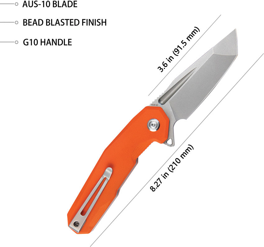 4.63" (11.76cm) closed. 3.63" (9.22cm) bead blast finish D2 tool steel tanto blade. Orange G10 handle. Extended tang. Lanyard hole. Pocket clip. Boxed.