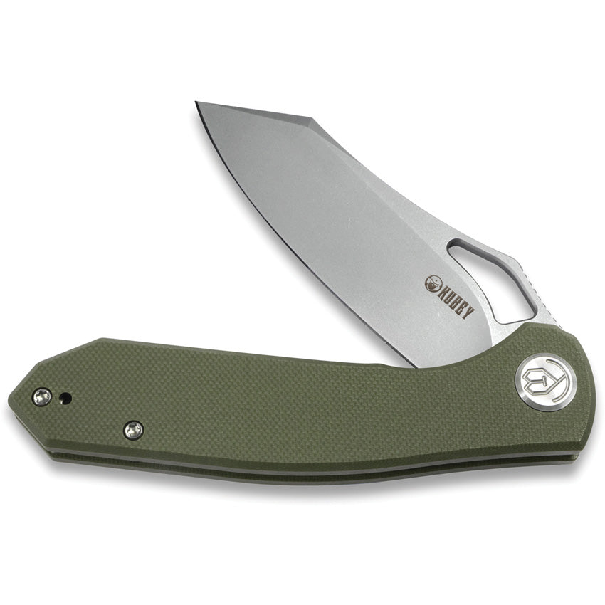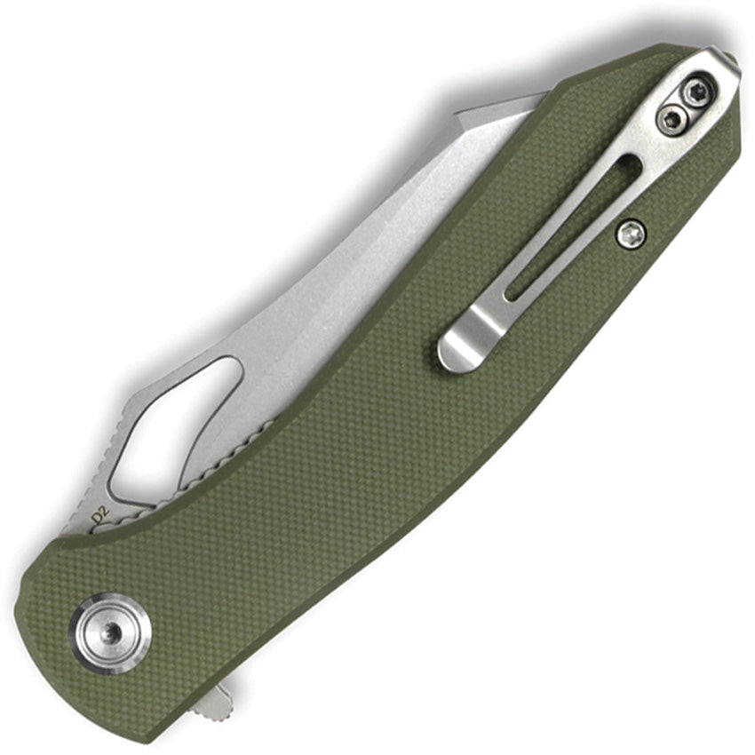 4.38" (11.13cm) closed. 3.38" (8.59cm) stonewash finish D2 tool steel blade. OD green G10 handle. Extended tang. Thumb pull. Pocket clip. Boxed.